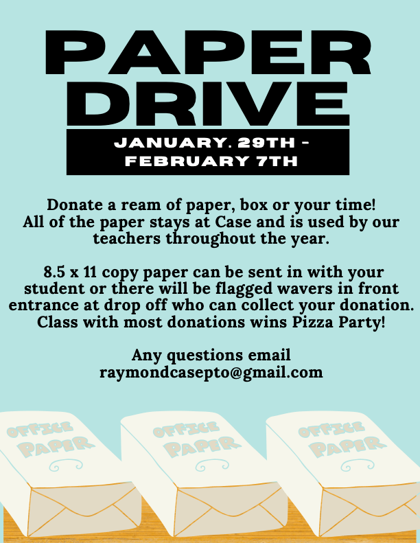 Donate a ream of paper, box of paper, or your time helping! All of the paper stays at Case and is used by our teachers throughout the year. paper can be sent in with your student or there will be flagged wavers at drop off and pick up who can collect your donations.