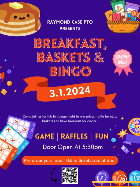 Come join us March 1, 2024 for a fun bingo night to win prizes, raffles for class baskets, and have breakfast for dinner.