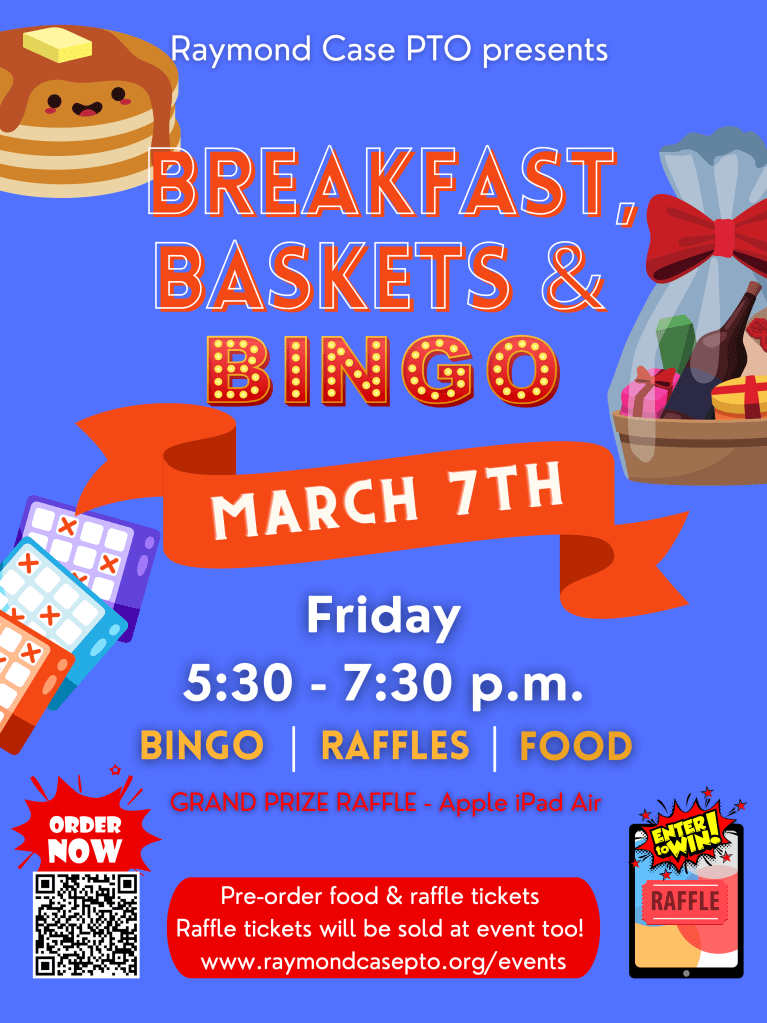 It’s time again to have Breakfast for dinner, Raffle on Baskets, play some Bingo and have a lot of fun!! We have bingo prizes to win and our Grand Prize at the end of the night will be an Apple iPad Air (generously donated by the Salinas Family) After all of the classroom baskets are raffled off we pull together all remaining tickets for the grand prize, so make sure you buy plenty of tickets for your chance to win!!