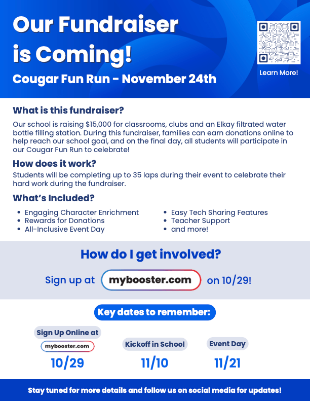 November 21, 2025! It’s time to rally together for our Cougar Fun Run fundraiser! Our goal is to raise $15,000 for support of our classrooms, teachers, clubs, and Elkay Filtrated Bottle Filling Water Stations, which will enhance our school’s resources and provide our students with an even better educational experience.